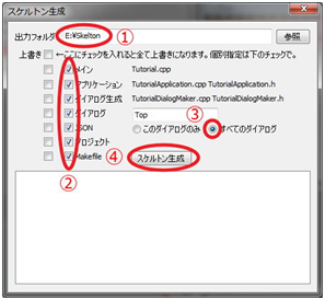 プロジェクトを保存する。 †[ファイル(F)]メニューを開いて[プロジェクトの保存(全てのリソース)]をクリックしてください。 ダイアログが表示されます。[ファイル名]に"Top"と入力して[保存]ボタンをクリックしてください。 #ref(): File not found: "dialog_save.png" at page "PlusG SMART Solution チュートリアル - アプリケーションの製作" スケルトンを出力する。 †[ファイル(F)]メニューを開いて[スケルトンの作成]をクリックしてください。 ダイアログが表示されます。以下の操作を行ってください。