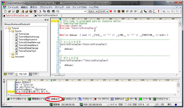 テキストボックスに結果が表示されます。 スケルトンコードを編集する。 †テキストエディターでスケルトン出力フォルダの"TutorialDialogTop.h"を開いて以下の箇所を改訂/追記してください。 24行目付近 void ResourceToDevice(); ↓ void ResourceToDevice(PGJsonObject*); テキストエディターでスケルトン出力フォルダの"TutorialDialogTop.cpp"を開いて以下の箇所を改訂/追記してください。 3行目付近 (なし) ↓ #include <fcntl.h> 40行目付近、OnInit 関数内 ResourceToDevice(); ↓ //ResourceToDevice(); 87行目付近、OnCondition 関数内 ResourceToDevice(); ↓ //ResourceToDevice(); 97行目付近、OnUpdate(PGJsonObject*,PGJsonObject*, const SGString) 関数内 PGDialog::OnUpdate(to,from,sessionid); ↓ PGDialog::OnUpdate(to,from,sessionid); ResourceToDevice(to); 155行目付近、ResourceToDevice() 関数定義 ResourceToDevice() ↓ ResourceToDevice(PGJsonObject* to) 157行目付近、ResourceToDevice() 関数内 (なし) ↓ SGString name = to->GetValue("Name").GetString();