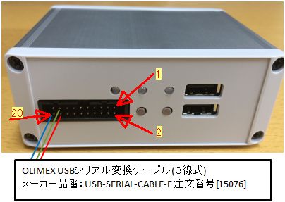 USBシリアル変換ケーブル1 †一番簡単な方法はストロベリーリナックスさんで販売している三線式USBシリアル変換ケーブルを接続する事です。弊社でも1500円でオプション販売しています。 ストロベリーリナックスさん型番 OLIMEX USBシリアル変換ケーブル(3線式) メーカー品番:USB-SERIAL-CABLE-F 注文番号[15076] 注意:上記のケーブルはWindows8(32bit/64bit)では動かないとのことです。 USBシリアル変換ケーブル2 †20PinコネクタからBBB標準の6Pin結線に変換する部分を自作します。 USBシリアル変換ケーブルはBBB標準のケーブルが使用できます。 ストロベリーリナックスさん型番 FTDI USB-TTLシリアルコンバータ(3.3V) メーカー品番:TTL-232R-3V3 注文番号[50030] ¥1512 秋月電子さん型番 FTDI USB シリアル変換ケーブル(3.3V) 通販コード M-05840 ¥1950 5V品と3.3V品があります。必ず3.3V品を使用してください。5V品を使用すると故障します。 関連 †社内リンク |