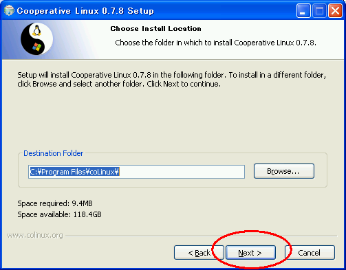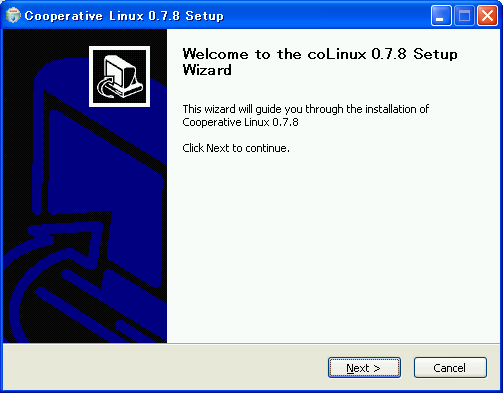 に移動して(英語サイトです)、左のMENUからDownloadをクリックします。sourceforge.netへのリンクが出てくるので、そちらに移動します。移動したら「coLinux-stable」のDownLoadをクリックします。次のページに移り、coLinux-0.7.8.exe(2011年3月時点の最新版)をクリックします。ようやくダウンロード可能です。 以下の手順で、もっとも標準的なインストールを行います。