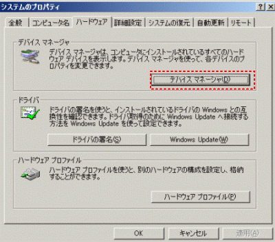 マイコンピュータを右クリック→プロパティ→ハードウェア→デバイスマネージャーを選択。