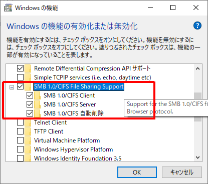 debian_squeeze_sambav1 †Windows10から debian squeeze の samba に接続を試みると エラー 0x80004005 が出て接続できない。 これは Windows10ではデフォルトで SMB V1 のサポートが入っていないため。以下の手順を行う事 windows のスタートメニューを開き検索box に control と入力して旧コントロールパネルを開く 「プログラム」を選択する 「Windowsの機能の有効化または無効化」を選択する 「SMB 1.0/CIFS File Sharing Support」以下を有効とする windowsを再起動する 関連 † |