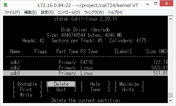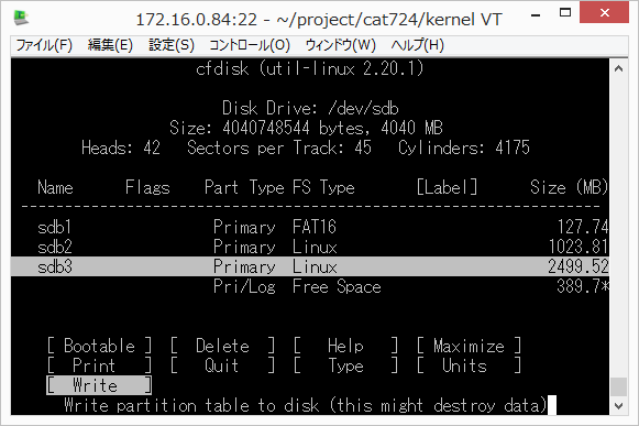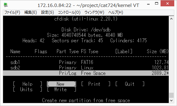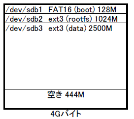 基本パーティションは最大4個作れます。基本パーティションの中に拡張パーテションが4つ作れます。図2の場合 p4 は見えません。p1,p2,p3,p5,p6,p7,p8 の7個になります。 パーティションサイズを決定する際に、CFやsdメモリの後ろに5%~10%の空きを作っておきます。 CFやsdメモリは銘柄によって多少サイズが違います。 dd (DD for Windows等) でイメージコピーする際、コピー先が少し小さい容量だとしても溢れないようにするためです。 メモリカードを大きくする場合のケーススタディ †メモリのコピーやパーティションのサイズ変更は開発用のLinuxPCで操作することをお勧めします。組込み機器実機ではメモリがマウント状態にあるのでrootfsのアンマウントやサイズ変更ができません。 2Gのメモリカードを使っていて、4Gに変更する場合 ddやDD for Windowsで2Gのイメージを4Gのメモリへコピーします。開発用LinuxPCに(USBメモリカードリーダなどを介して)挿入し /dev/sdb として認識したとします。図のようになります。 cfdiskで見るとこんな感じ (開発PCにて /dev/sdb デバイスとして認識した場合) # cfdisk /dev/sdb Disk Drive: /dev/sdb