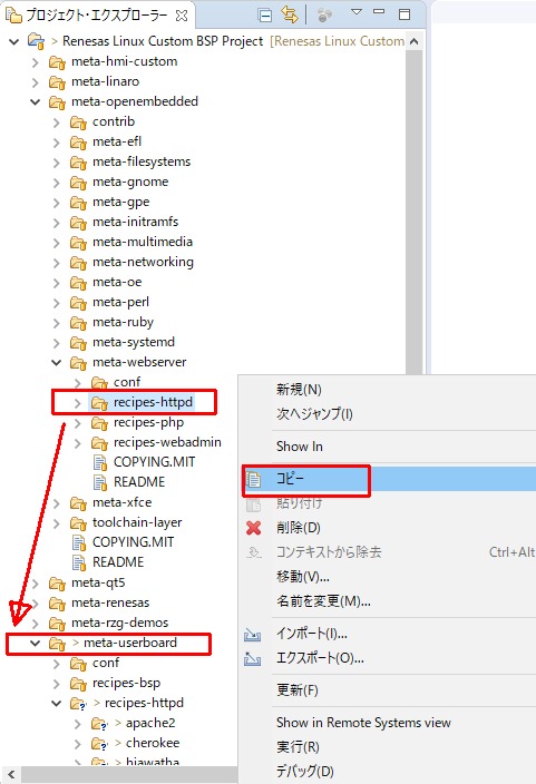 renesas_cloud_build_seminor_option †CAT845対応レシピのコピー †meta-renesas フォルダをカスタムBPSプロジェクトのフォルダへコピーする(CTRL+C, CTRL+V) コピー元:配布DVD(デスクトップ上)の \download\ コピー先:C:\Users\user\e2_studio\workspace\Renesas Linux Custom BSP Project\ webサーバー nostromo の組み込み †nostromo は別名 nhttpd と呼ばれる軽量webサーバである プロジェクトエクスプローラーから meta-openembedded