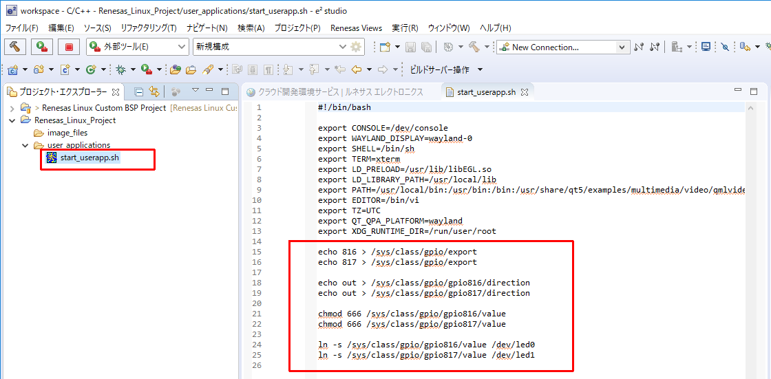 を編集し、 echo 816 > /sys/class/gpio/export echo 817 > /sys/class/gpio/export echo out > /sys/class/gpio/gpio816/direction echo out > /sys/class/gpio/gpio817/direction chmod 666 /sys/class/gpio/gpio816/value chmod 666 /sys/class/gpio/gpio817/value ln -s /sys/class/gpio/gpio816/value /dev/led0 ln -s /sys/class/gpio/gpio817/value /dev/led1 を追加する 関連 †自動リンク |