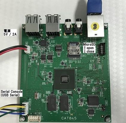TeraTermを開き、シリアルコンソール(COM x)を開く。 microSD を rootfs として起動する †電源を投入し Hit any key to stop autoboot: 3.. 2.. 1.. の3秒間のカウントダウン中に何かキーを押すと u-boot のプロンプトで停止する トラブルシュート TeraTerm画面が文字化けしたときは コントロール=>端末のリセット で復旧する u-bootにて => run boot_from_sd => reset このときに ## Error: "boot_from_sd" not defined エラーが出るときは uboot が古いので CAT845_uboot更新手順 に従い ubootを更新してください。 microSDからLinuxが起動する トラブルシュート u-bootで停止してしまいエラーもないのに Linuxが起動起動しないときは => setenv bootdelay 3 => saveenv => reset とする トラブルシュート LANケーブルは必須ではないが初期状態だとdhcpでアドレスを取得しに行くのでLANケーブルが接続されていないと 起動中に数分間待たされる。LANケーブルを接続しdhcpでアドレスが取得できる状態であればスムースに進む。 Linux起動後に FlashRomのイレースセクタサイズを調べる cat845 login: root Password:root (パスワードは画面に表示されない) root@cat845:~# cat /proc/mtd dev: size erasesize name mtd0: 00080000 00010000 "loader" mtd1: 00580000 00010000 "uboot" mtd2: 00600000 00010000 "kernel" mtd3: 03400000 00010000 "flash" erasesize が 00010000 であれば 64Kバイト/セクタ erasesize が 00040000 であれば 256Kバイト/セクタ(CAT845初期ロット品のみ) 内蔵ROMのイレースと書き換え †root@cat845:~# mount /boot/ -o ro root@cat845:~# flash_erase /dev/mtd3 0 0 root@cat845:~# cp /boot/mtd2_uImage+dtb_cat845_20190924 /dev/mtdblock2 root@cat845:~# cp /boot/mtd3_jffs2_cat845_20200131_64k.bin /dev/mtdblock3 (ただし 256Kバイト/セクタ品の場合ファイル名の末尾 _256k.bin を使うこと) root@cat845:~# umount /boot 再起動 root@cat845:~# reboot 内蔵ROM を rootfs として起動する †u-bootにて => run boot_from_mtd => reset 関連 † |
