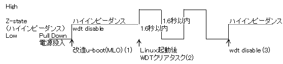 WDTの使い方 †(1)電源投入時 †BeagleBoneBlack 起動には P9_30番ピンは PullDown有りの入力になっています。ところがこの状態では内蔵Auto Reset Oscillatorが働かず1.6秒後にリセットされてしまいます。そこで電源投入直後に P9_30番ピンを PullUp/PullDown 無しの入力 = ハイ・インピーダンスにする必要があります。 U-BOOT(MLO)の改造 †改造後のビルド済み MLO はこちら(v2014.07 を 2014-09-10 にビルドした) ソースから自分でビルドする場合 u-bootの2段ブートのうち、前段であるMLOソースを改造してビルドし直します。