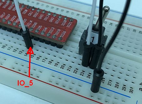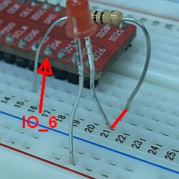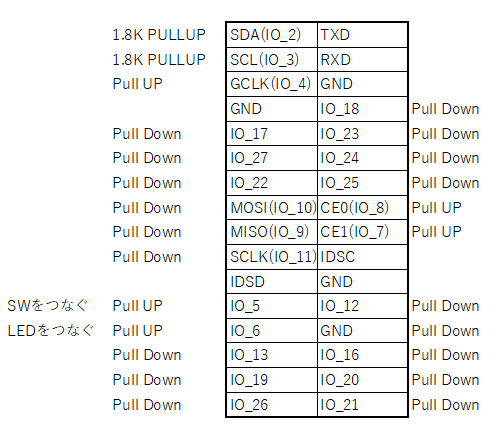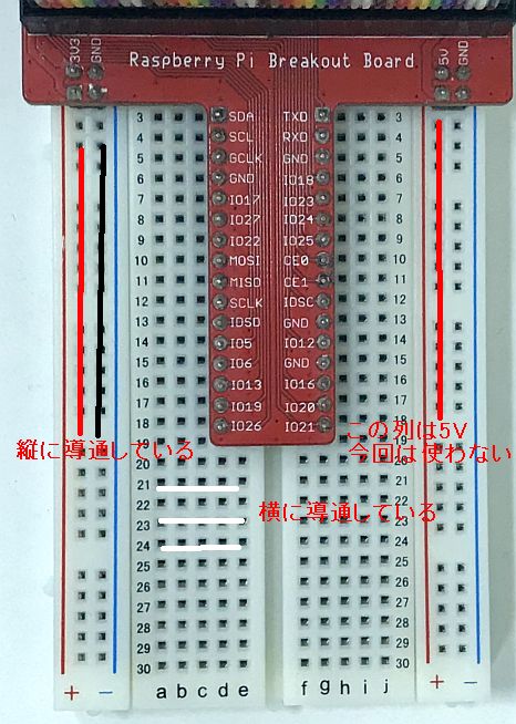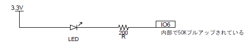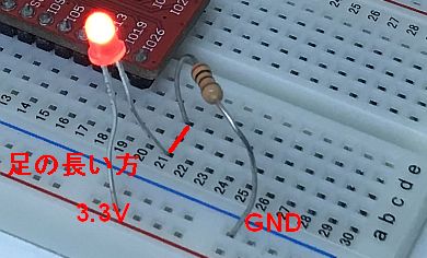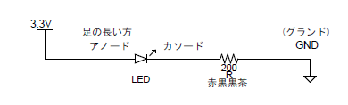 RasPi3_LED †ラズパイでLチカ(LEDチカチカ)しよう 回路 †ブレッドボード †IO2,3はCPU外部で1.8Kプルアップされています。 まずは電源直結で点灯試験 †点灯することを確認する。点灯しない場合はLEDの向きを確かめる。足の長い方(アノード)を3.3V側にする。 「赤(AK)いLED」と覚える。緑でも青でも「赤(AK)いLED」と覚える。A(アノード) -> K(カソード)の向き。Aがプラス側。 GPIOへ接続 †点灯が確かめられたら抵抗の先をIO6に接続する。IO6はCPU内部でプルアップされ3.3Vになっている。LEDの両端が3.3Vのため電流は流れず、点灯しない。 GPIOの操作 †ラズパイでrootユーザでログインする root@raspberrypi:~# IO6を使えるようにする # echo 6 > /sys/class/gpio/export 入出力方向(direction)の確認 # cat /sys/class/gpio/gpio6/direction in 出力にする # echo out > /sys/class/gpio/gpio6/direction # cat /sys/class/gpio/gpio6/direction out この時点でLEDが点灯する 電圧をHigh (3.3V)にする 消灯する # echo 1 > /sys/class/gpio/gpio6/value 電圧をLow (0V)にする 点灯する # echo 0 > /sys/class/gpio/gpio6/value スイッチの読み込み †スイッチの片側をGND, 真ん中をIO5に接続する ラズパイでrootユーザでログインする root@raspberrypi:~# IO5を使えるようにする # echo 5 > /sys/class/gpio/export 入出力方向(direction)の確認 # cat /sys/class/gpio/gpio6/direction in 入力になっているので value を読む # cat /sys/class/gpio/gpio5/value 1 スイッチを倒す # cat /sys/class/gpio/gpio5/value 0 Lチカプログラム †パスが長すぎてタイプが面倒なのでシンボリックリンクを作る # ln -s /sys/class/gpio/gpio6/value /dev/led0 # ls -l /dev/led0 lrwxrwxrwx 1 root root 27 Oct 26 11:28 /dev/led0 -> /sys/class/gpio/gpio6/value シェルによるLチカ †# while true (C言語でいうところの while(1))